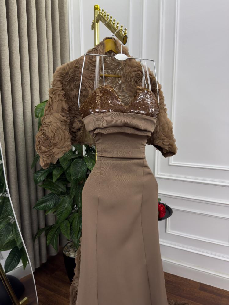 فستان سهرة مميز بلون برونزي جذاب، مصنوع من خامة الباربي الفاخرة التي تمنحك ثبات وأناقة عالية. مزين بلمسات من الورود ثلاثية الأبعاد على الرداء الجانبي لتعكس فخامة استثنائية. قصة ضيقة تبرز جمال القوام مع لمعة فاخرة تخطف الأنظار في كل خطوة