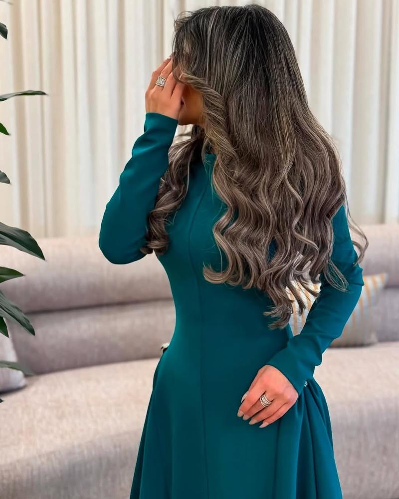 فستان أخضر زمردي أنيق بقصة انسيابية وأكمام طويلة