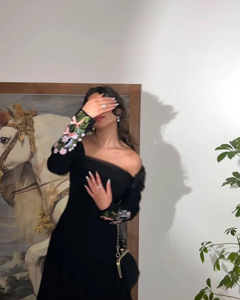 فستان أسود قصير بأكمام طويلة مطرزة وتصميم مكشوف الأكتاف مع شنطه مجانا 0034