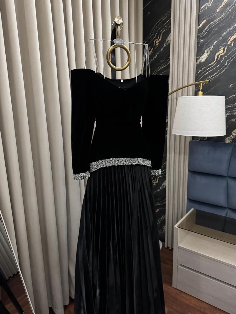فستان أنيق يجسد الفخامة والبساطة في آنٍ واحد، بتصميم ملفت باللون الأسود الكلاسيكي. يتميز الجزء العلوي بقماش الجوخ الفاخر، الذي يضفي لمسة من الدفء والرقي، مع أكمام طويلة تعزز من جمال التصميم. يتناغم هذا الجزء بسلاسة مع التنورة الكلوش المصنوعة من قماش الميكادو اللامع، الذي يضفي انسيابية وأناقة على الإطلالة. الفستان مثالي للمناسبات الرسمية والسهرات، حيث يجمع بين البساطة والتفاصيل الراقية التي تعكس الذوق الرفيع.