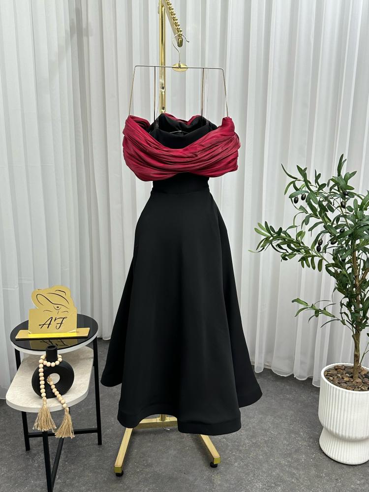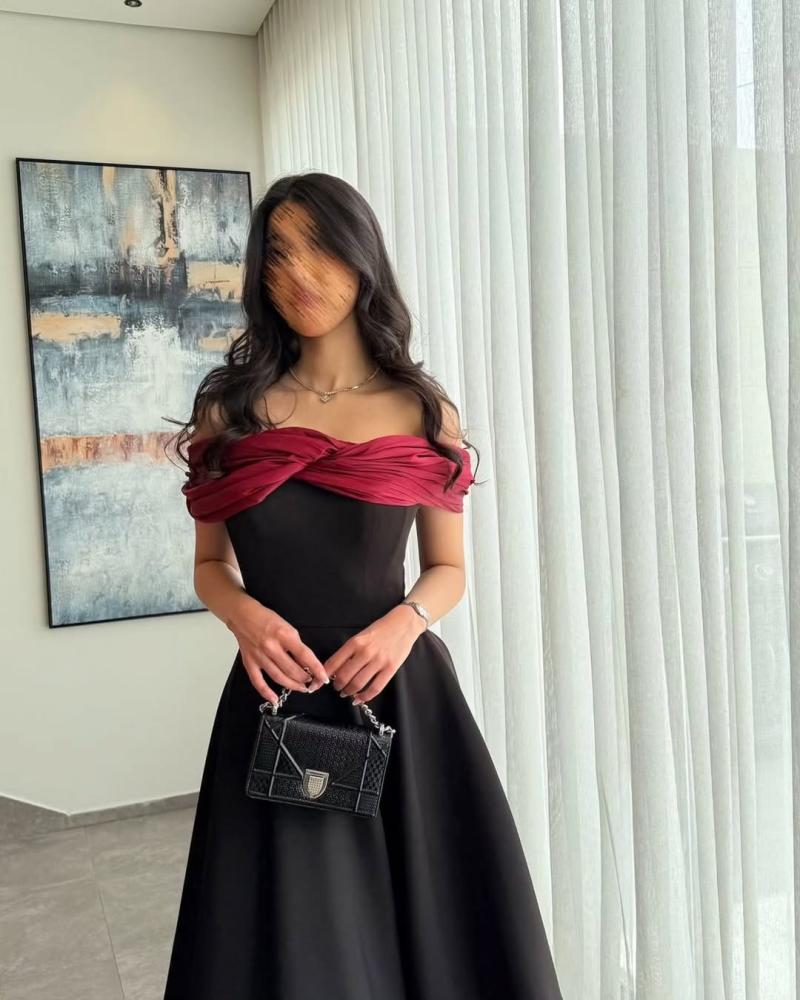 فستان سهرة أنيق بتصميم كلاسيكي، يجمع بين الرقي والجاذبية. مصنوع من قماش أسود فخم بقصة واسعة تمنح إطلالة راقية ومريحة. يتميز بأكتاف مكشوفة مع لمسة من القماش الكرنكل المتداخل لإضافة لمسة فاخرة وأنثوية. مثالي للمناسبات الخاصة والحفلات، ويمكن تنسيقه مع إكسسوارات بسيطة لإطلالة ساحرة.