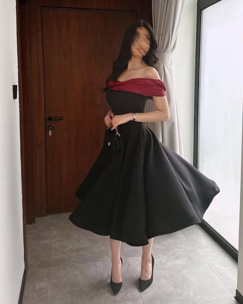 فستان ميد أسود بأكتاف مكشوفة كلاسيكي