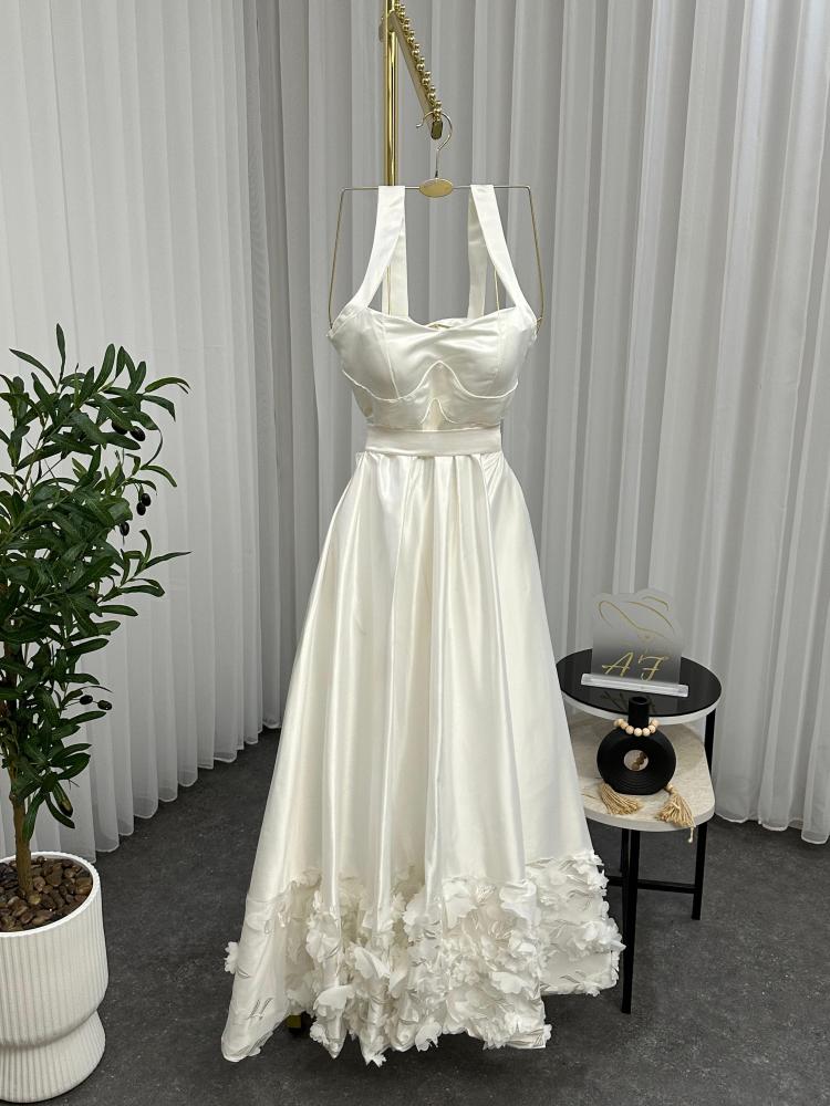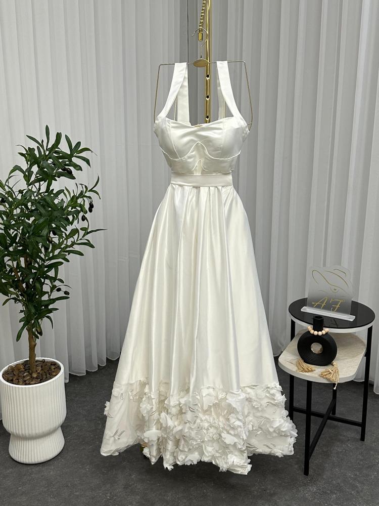 فستان العيد فستان فخم أوف وايت بخامة التفته مع ورود بارزه