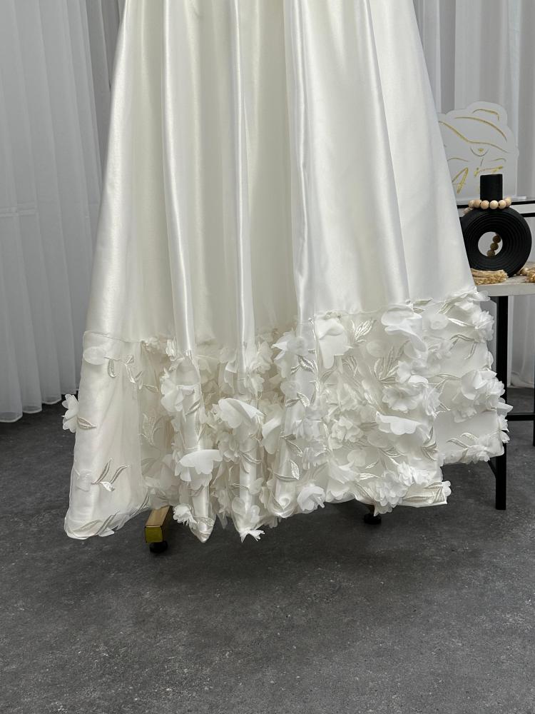 التصميم : فستان ابيضّ بخامة التفته مزين بورود بارزه تحت الفستان