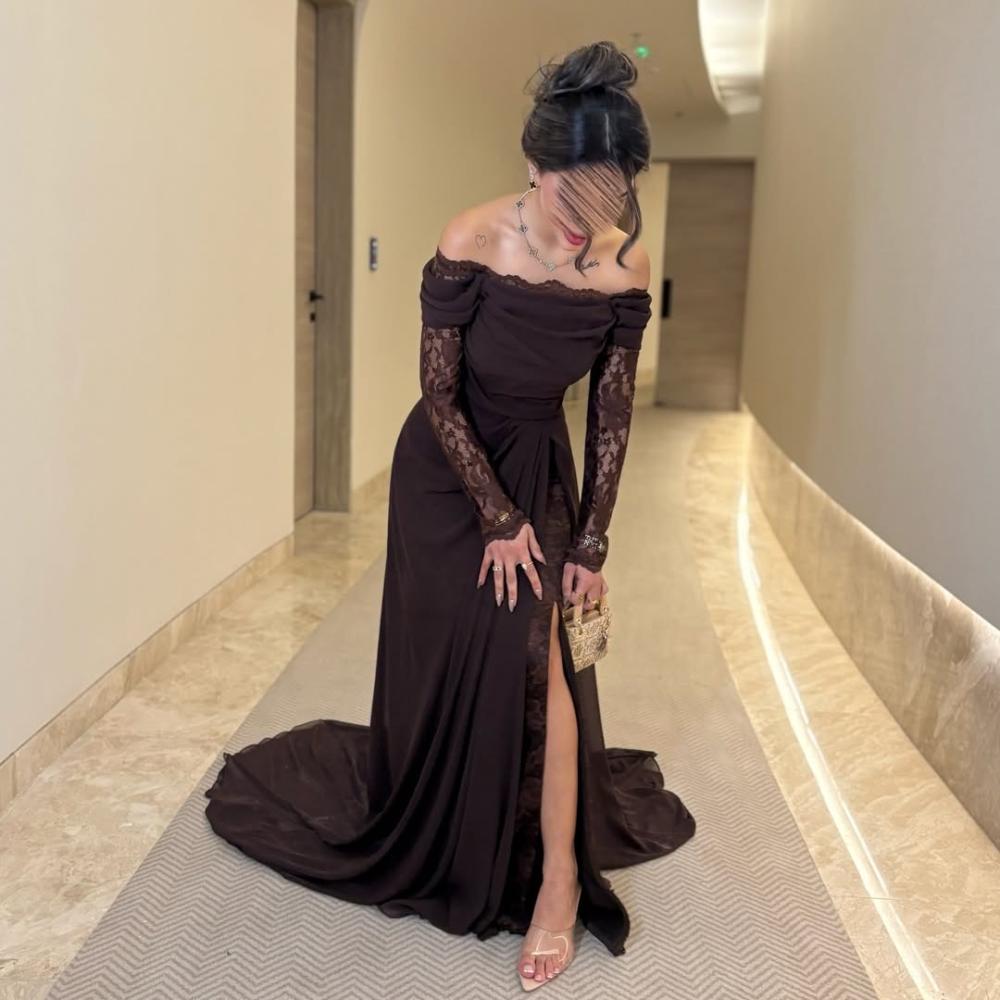 فستان بني انيق بخامة الشيفون الجورجيت الكوري مبطن/ دانتيل