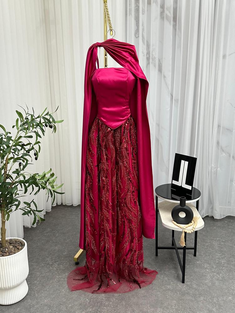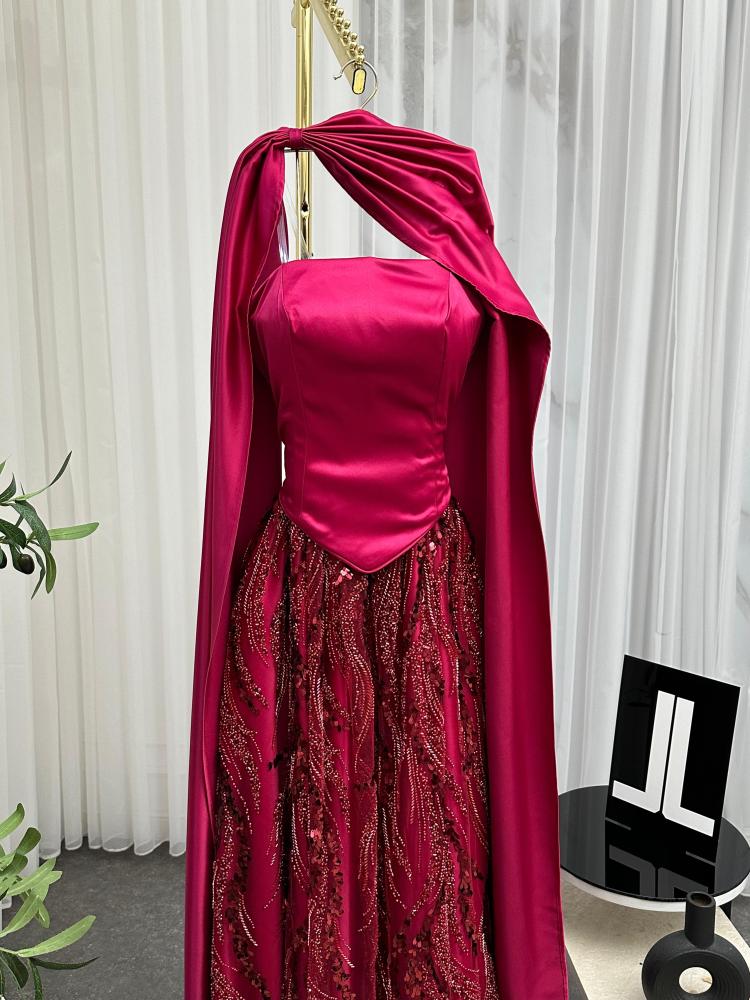 • مرفق شال طويل بلون الفستان، يعزز فخامة الإطلالة ويناسب الحفلات والمناسبات الخاصة.